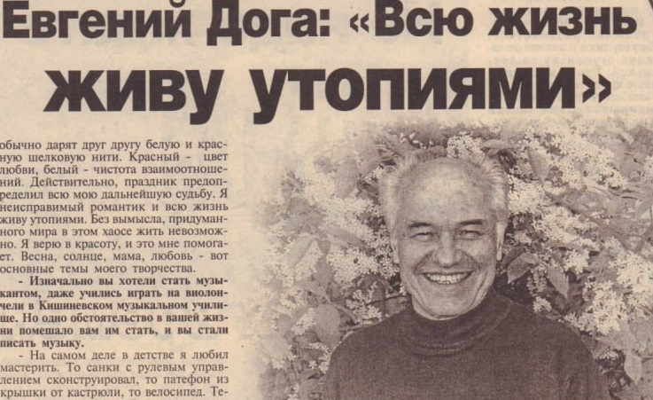 Сегодня, 1 марта, выдающемуся композитору Евгению Доге исполняется 88 лет. Он родился в 1937 году в селе Мокра Рыбницкого района. Окончил Колледж музыки имени Штефана Няги, а затем Консерваторию и Институт искусств имени Гавриила Музическу в Кишиневе.